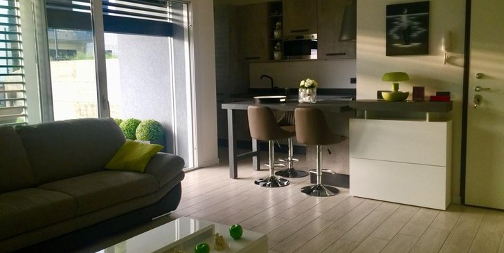 Bilocale a Piano Terra con soggiorno con cucina a vista, una camera, un bagno, disimpegno, portico e giardino di proprietà di 45 mq. Classe