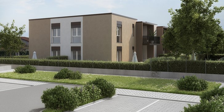Trilocale al piano secondo con cucina a vista, soggiorno, due bagni, due camere, terrazzo e box doppio. Classe energetica A4 (valore di prog
