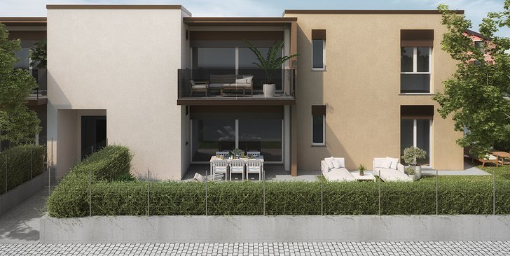 Trilocale al piano terra con portico e giardino ad uso esclusivo di 100 mq, con annesso box doppio a piano interrato. Classe energetica non