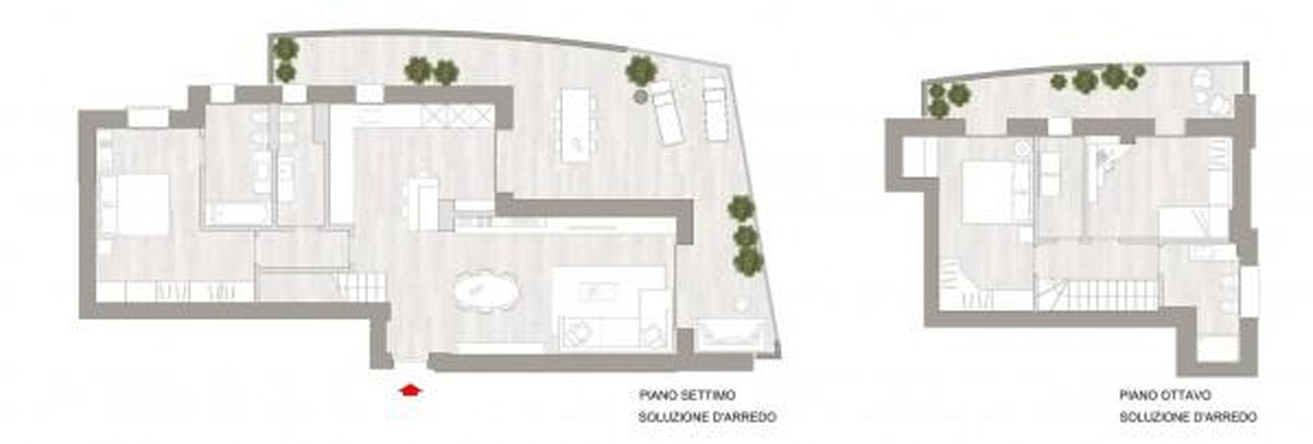 Prestigioso attico al settimo e ottavo piano. L’ingresso, situato al settimo piano, conduce alla grande zona giorno con affaccio sulla prima grande terrazza di 49 mq. Gli affacci sull’esterno sia dalla cucina che dal living tramite grandi vetrate, consentono di godere al meglio dello spazio out-door lontano dai rumori e con una vista esclusiva e creano uno spazio armonioso e facile da vivere. La cucina e sala da pranzo permettono scelte moderne ed eleganti senza limiti di spazio. Piena libertà nell’arredare con fantasia e in linea con le abitudini della famiglia valutando la possibilità di chiudere la cucina creando un ambiente più raccolto o lasciano lo spazio open . Al settimo piano troviamo anche la camera padronale con bagno privato ed un secondo bagno per l’uso quotidiano. Attraverso una scala interna si accede al piano superiore dove troviamo le altre 2 camere da letto con bagno e una comoda lavanderia/stireria. Dalle camere si accede direttamente alla seconda terrazza di 14 mq. Materiali e finiture di pregio,vetrate over-size per farsi avvolgere dalla luce naturale e dalla bellezza del verde. Nel cuore della città, tutti i servizi sotto casa, senza rinunciare alla tranquillità. La scelta dei materiali e dotazioni con living now smart, fibra ftth, pavimenti florim o itlas, sanitari flaminia e cura dei dettagli danno un tocco di esclusività a un design lineare ed armonioso