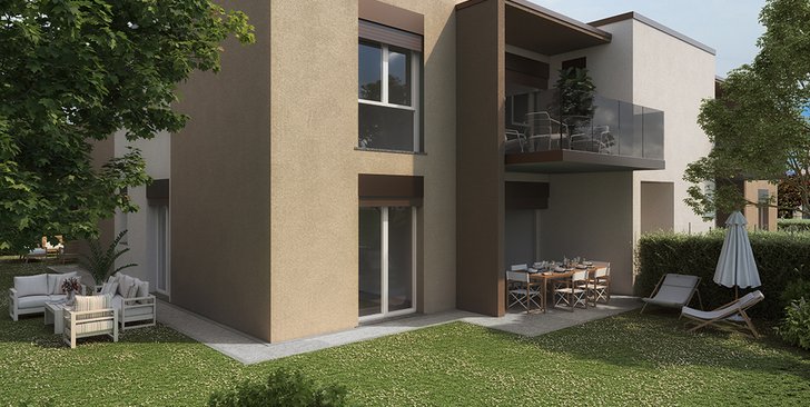 Trilocale a Piano terra con cucina/soggiorno, due camere, due bagni e balcone di 13 mq. Classe energetica A3 (valore di progetto indicativo)